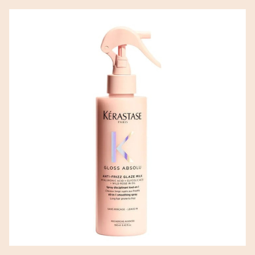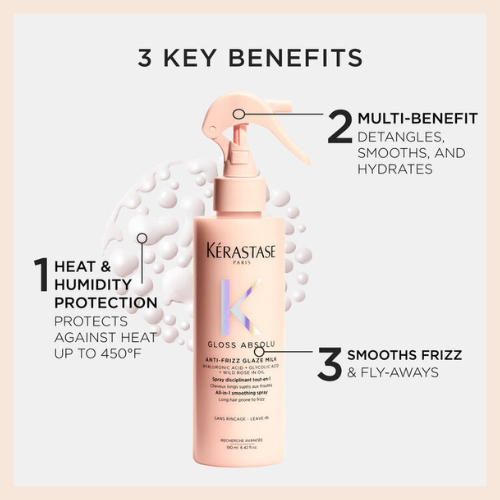 Discover the ultimate multi-tasker with Kérastase Gloss Absolu Glaze Milk Anti-Frizz Heat Protecting Spray. Powered by glycolic acid and wild rose oil, this lightweight spray instantly detangles, hydrates, and smooths hair while providing long-lasting frizz control and protection against heat styling tools up to 450°F.