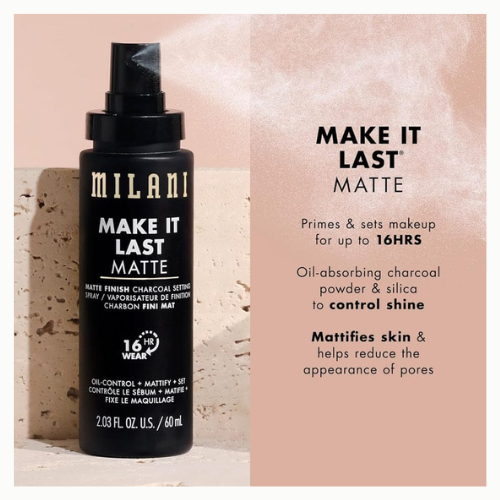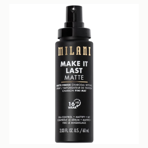 Oil-absorbing Milani Make It Last Charcoal Matte Setting Spray locks makeup up to 16 hours. With charcoal & silica for a shine-free, poreless matte finish.